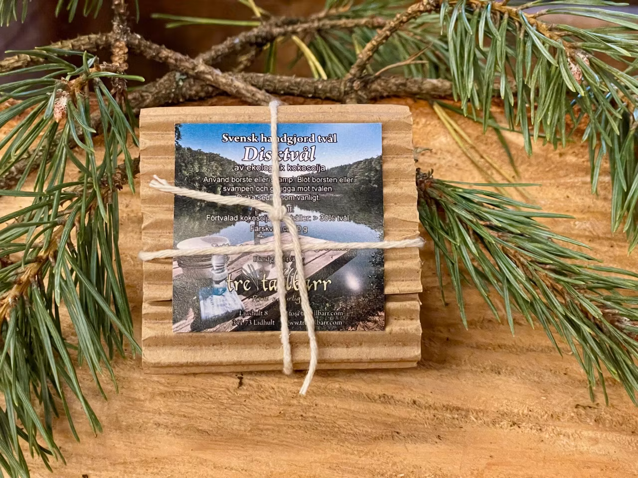 är handgjord av ekologisk törtvålad kokosolja – helt fri från tillsatser, parfym och plast. Den gör disken skinande ren, samtidigt som den är skonsam för både dig och miljön. Den ger ett fint och stabilt lödder som rengör disken mycket bra. Ingen doft är tillsatt men en svag doft av kokosoljan kommer givetvis fram.