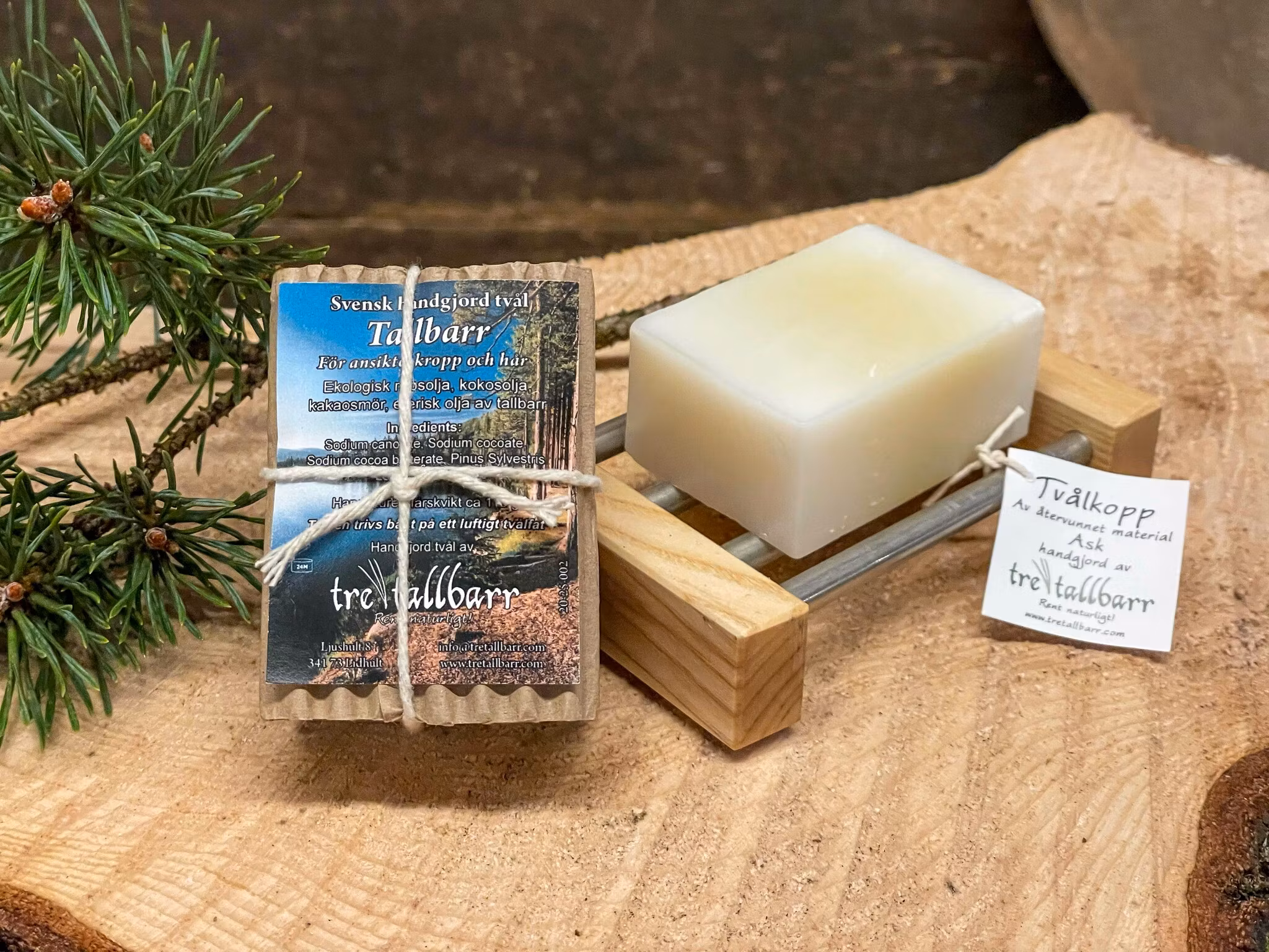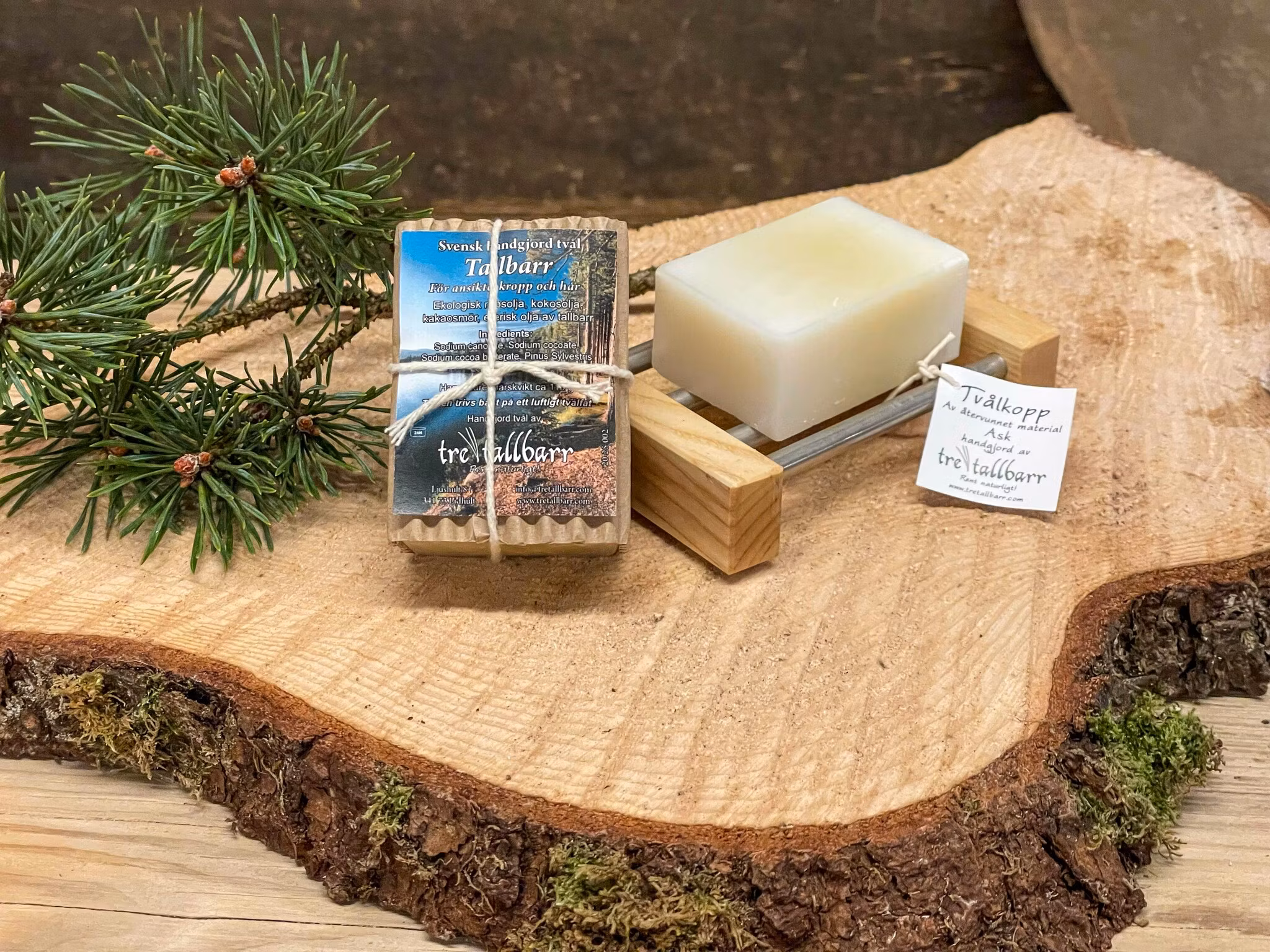 Ett paketpris på två stycken av vår populära tvål Tallbarr och en tvålkopp i ask till ett förmånligt pris. Tallbarr är en fast tvål tillverkad för hand av