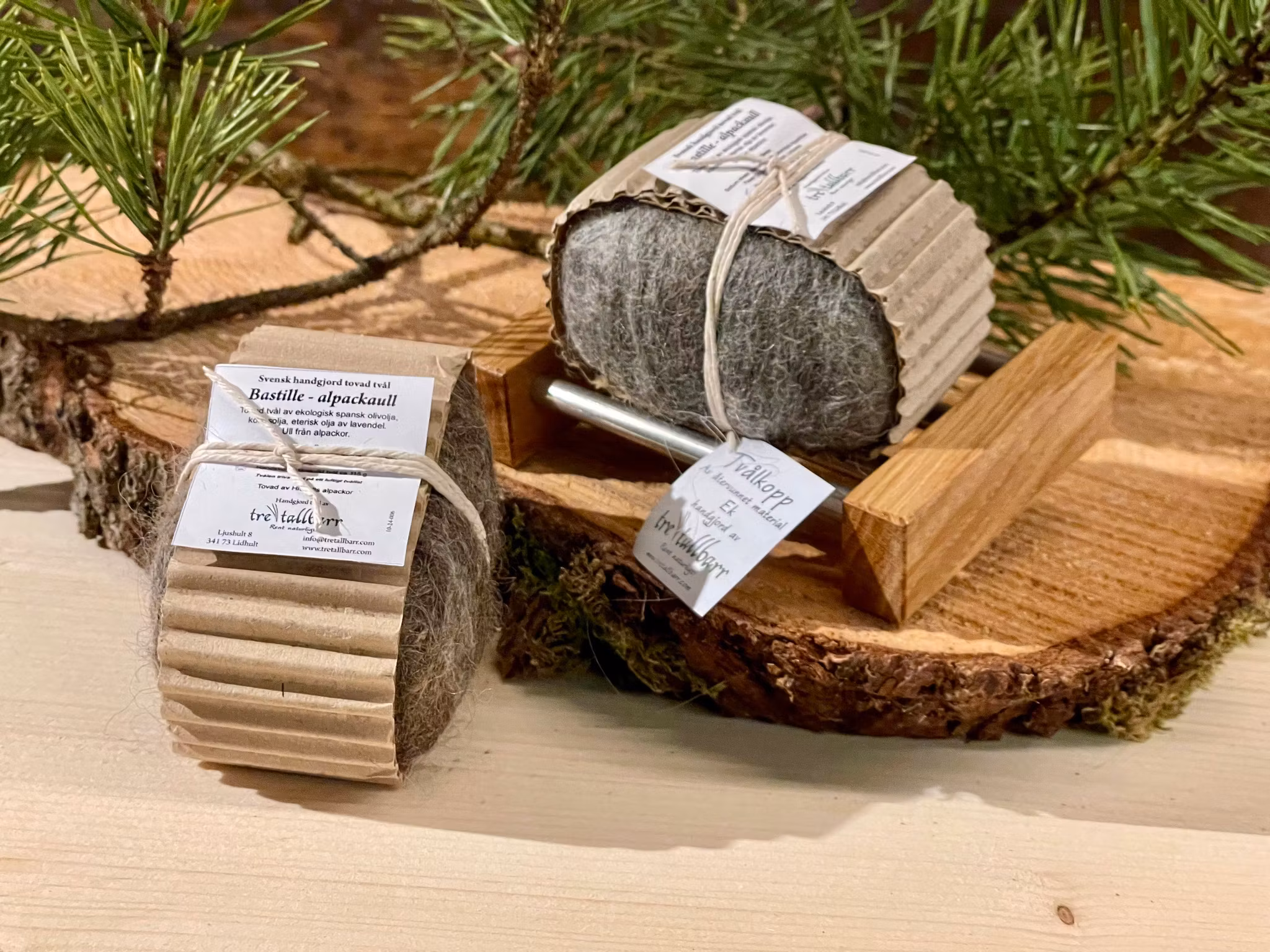 Dessa tvålar tovas med ull från alpacka av Hishults alpackor. Ullen kommer från gårdens egna alpackor. En tovad tvål ger en mjuk och behaglig skrubb. Dessutom flyter den i vatten.